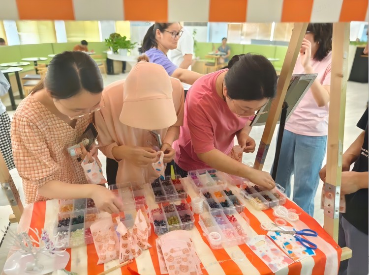 彩珠斑斕,猶如繁星點點,在場的海陵員工精心挑選了自己心儀的珠子,以靈巧的雙手,將這些絢爛的彩珠編織成一條條獨一無二的手鏈。