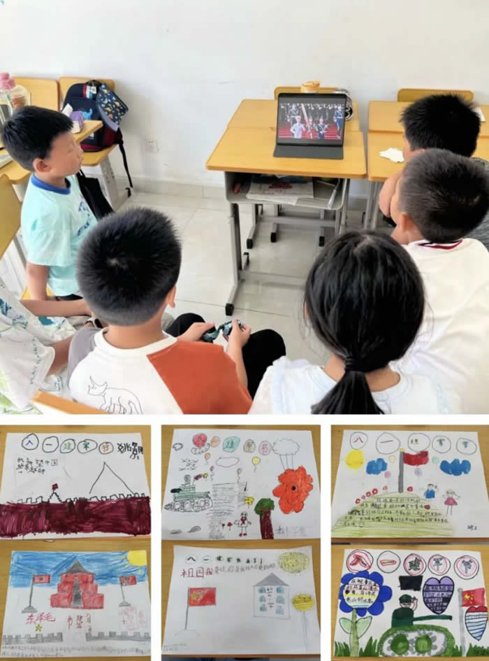 “八一”建軍節(jié)之際,老師組織了孩子們觀看閱兵儀式視頻,讓大家感受軍人的風(fēng)姿、武器的先進和國力的強大,也借此機會對孩子們進行了愛國主義教育。孩子們將心中對祖國的美好祝福,一筆一畫地描繪在張張白紙上,用五彩繽紛又充滿想象力的畫作共同慶祝“八一”建軍節(jié)。
