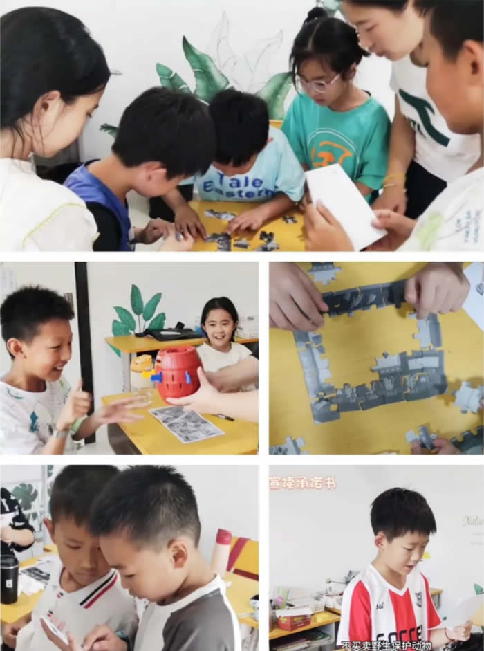 適合孩子們的“劇本殺”是什么樣的?今年暑托班期間,小朋友們在老師的主持下體驗了沉浸式劇本游戲《抓住那只兔子》。孩子們跟著兔子偵探留下的線索,一點點揭穿了動物王國偷偷買賣珍惜野生動物的鷹鷹老板!生動的劇情不僅帶大家了解保護野生動物的重要性,更讓他們明白要保護自己、遠離危險。劇情中的謎題游戲還鍛煉了觀察力、動手動腦能力、訓(xùn)練了思維邏輯。
