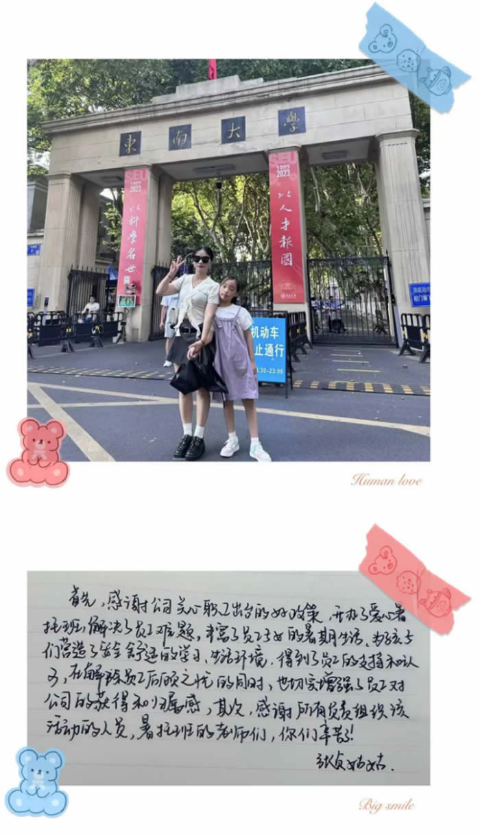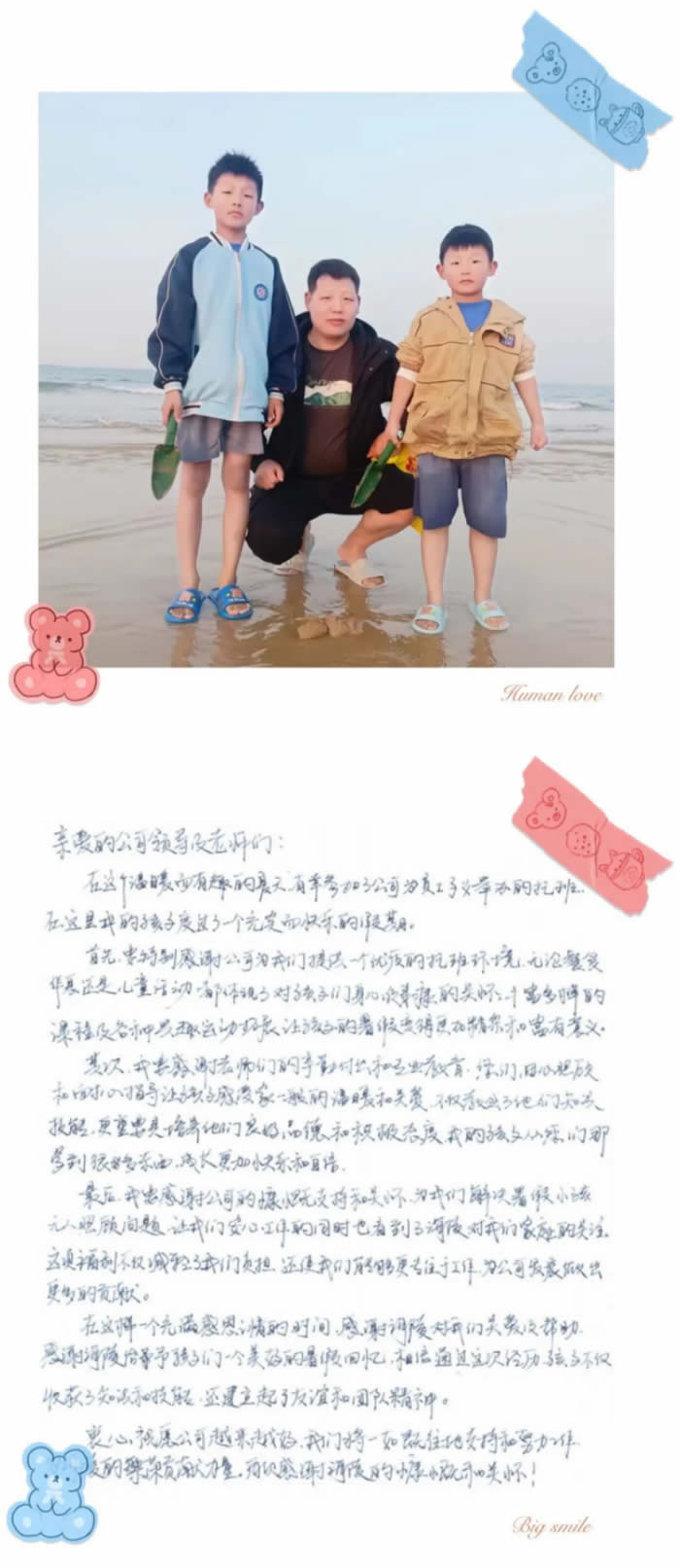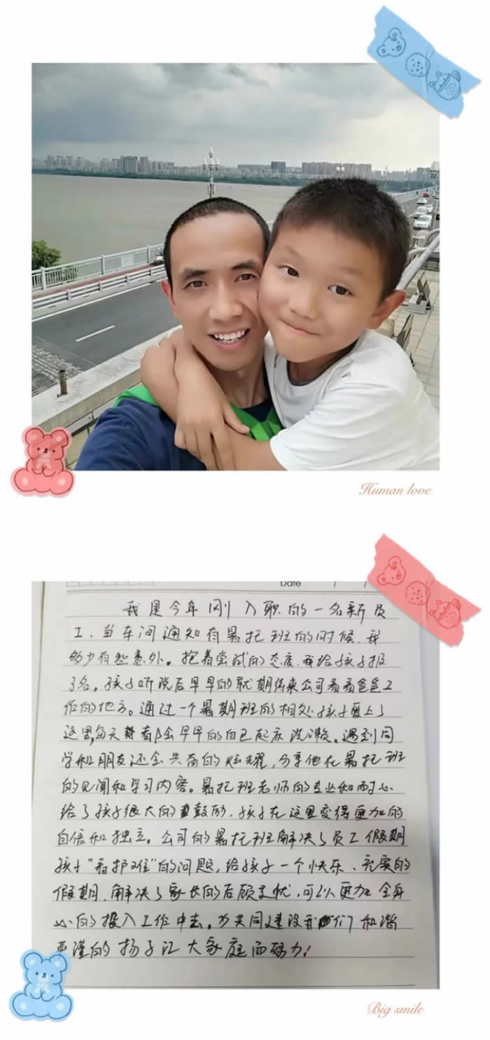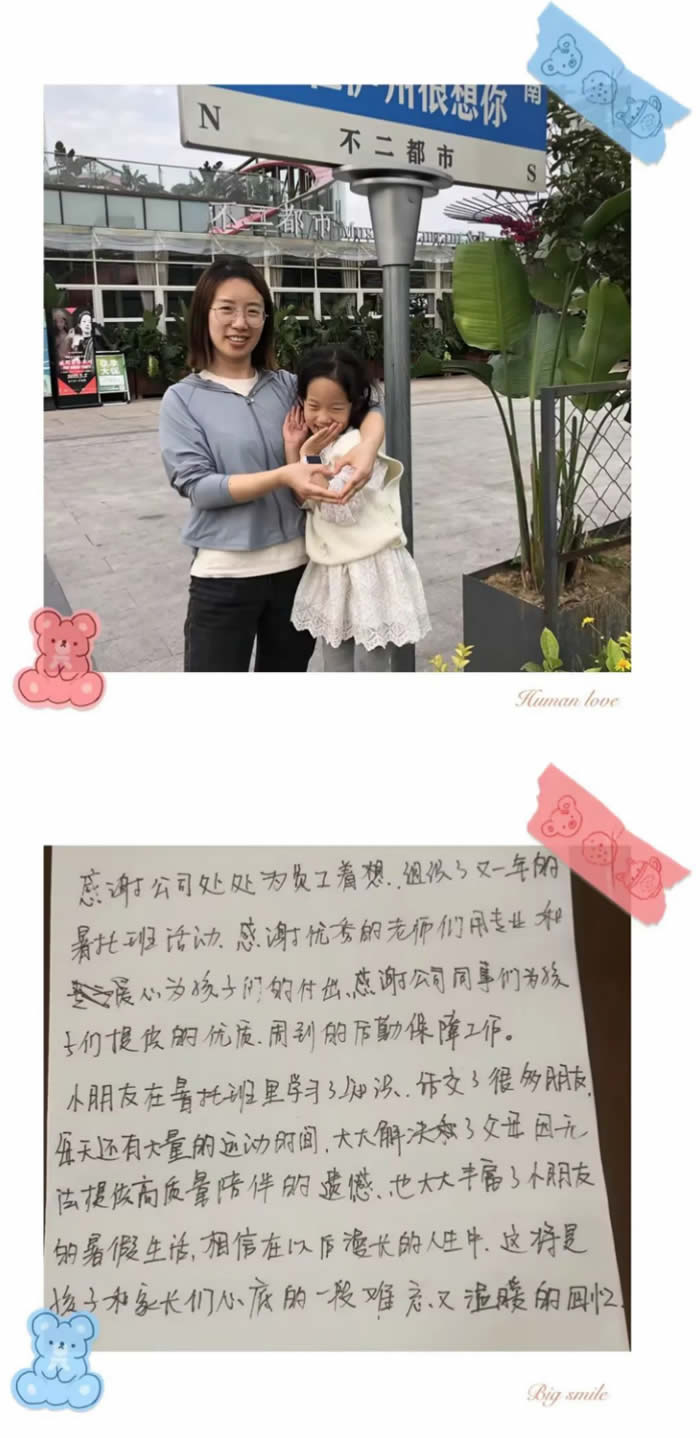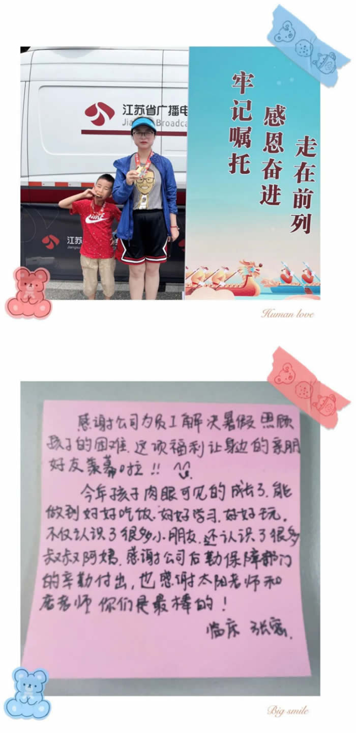 感謝公司為員工解決暑假照顧孩子的困難,這項福利讓身邊的親朋好友羨慕啦!今年孩子肉眼可見的成長了,能做到好好吃飯、好好學(xué)習(xí)、好好玩。不僅認識了很多小朋友,還認識了很多叔叔阿姨。感謝公司后勤保障部門的付出,也感謝太陽老師和龐老師,你們是最棒的!