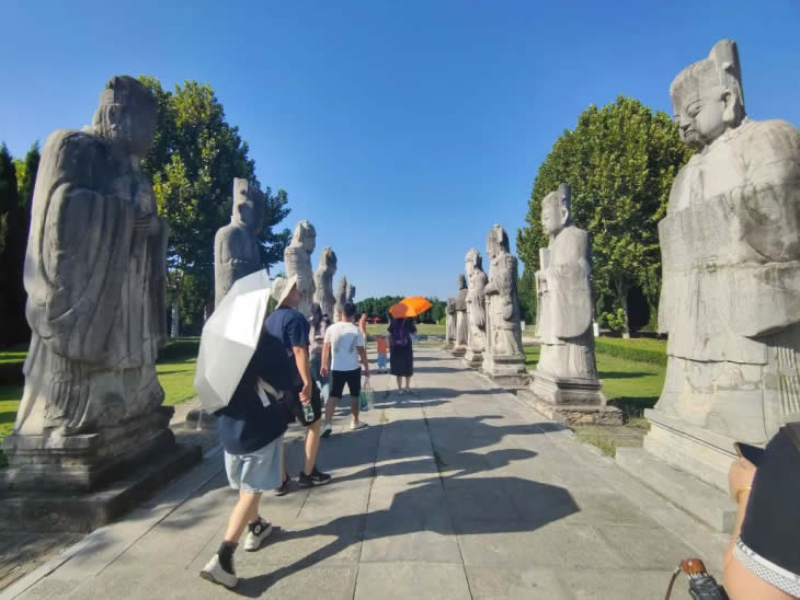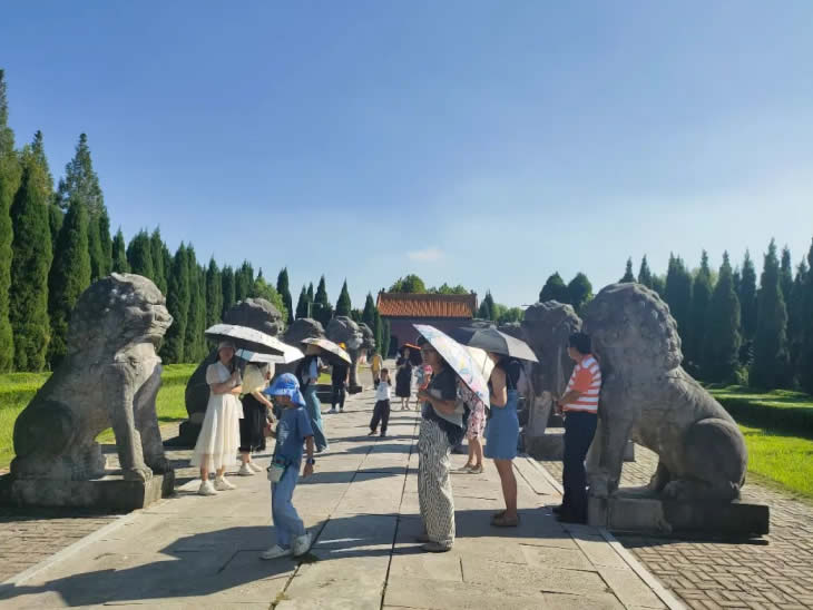 中午,大家在農(nóng)家樂品嘗了當?shù)靥厣↓埼r,隨后坐車前往第二站明祖陵。這里被譽為全國唯一一座水下皇陵,承載了朱明興衰的塵煙。工匠與家屬們漫步在陵墓神道之上,在講解聲中觀察幾百年前的石刻群像,體會其中的歷史余韻與時代遺音。石像歷經(jīng)幾百年時光仍然細節(jié)豐富、栩栩如生,然而六朝舊事隨流水,百年帝業(yè)亦成空。
